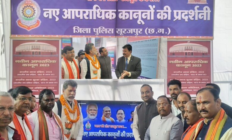 सूरजपुर में नए आपराधिक कानूनों की भव्य प्रदर्शनी — प्रदेश अध्यक्ष किरण सिंहदेव, मंत्रियों व जनप्रतिनिधियों ने लिया अवलोकन, नई व्यवस्था को बताया मजबूत पुलिसिंग का आधार…