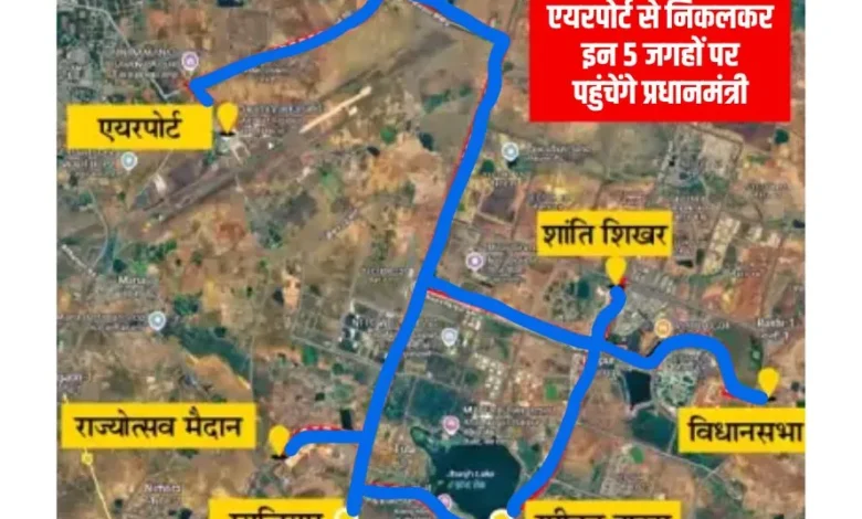 •  सेक्टर-2 से पीएम मोदी मंदिर हसौद टर्निंग, कायाबांधा, सेक्टर-20 स्थित शांति शिखर जाएंगे, यहां से एकात्म पथ होते हुए मंत्रालय के पीछे से विधानसभा भवन पहुंचेंगे.