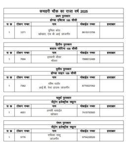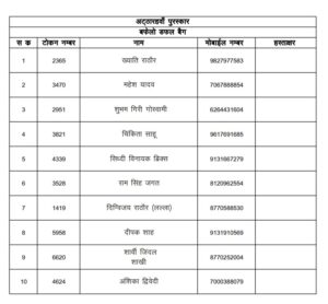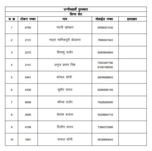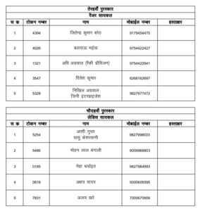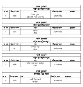जांजगीर चांपा: जिला मुख्यालय के कचहरी चौक के राजा के मयूर महल पंडाल की भव्यता का देखने के लिए राज्य भर से रोजाना हजारों श्रद्धालु पहुंच रहे थे वही शाम आरती के समय बप्पा का दरबार श्रद्धालुओ से भरा रहता था, वही आपको बता की 6 सितंबर को रात्रि लकी ड्रा निकला गया है, जिसमें सौभाग्यशाली विजेता को बप्पा जी आशीर्वाद आर्शीवाद के रूप ने ईनाम मिला है. जिसके लिए लिस्ट जारी कर दिया गया है, देखिए लिस्ट में कही आपका नाम तो नहीं..