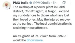 पीएमओ ने लिए संज्ञान…इस भीषण हादसे को लेकर प्रधानमंत्री कार्यालय (PMO) ने भी संज्ञान लिया है। पीएमओ की ओर से जारी संदेश में घटना पर गहरा दुख व्यक्त किया गया है, ट्वीट में कहा गया है कि छत्तीसगढ़ के शक्ति जिले में स्थित विद्युत संयंत्र में हुई दुर्घटना अत्यंत दुखद है, जिन लोगों ने अपने प्रियजनों को खोया है, उनके प्रति गहरी संवेदना व्यक्त की गई है, वहीं घायलों के शीघ्र स्वस्थ होने की कामना की गई है।