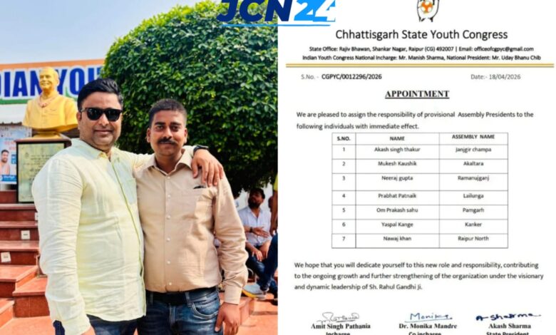 - जांजगीर-चांपा में युवा कांग्रेस को मिली नई टीम, आकाश सिंह ठाकुर बने विधानसभा अध्यक्ष